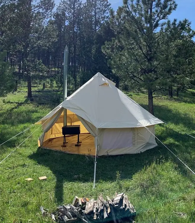 Many bell tents include upgrades like stove pipe jacks, sidewalls, or awnings. The Yukon Bell Tent, for example, has an uncut stove pipe jack to accommodate different stove sizes, providing heating options for colder conditions. Tie-back sidewalls and additional ventilation options allow customization for comfort and usability across seasons, too. These features expand functionality and make the tent adaptable to different environments and year-round usage.