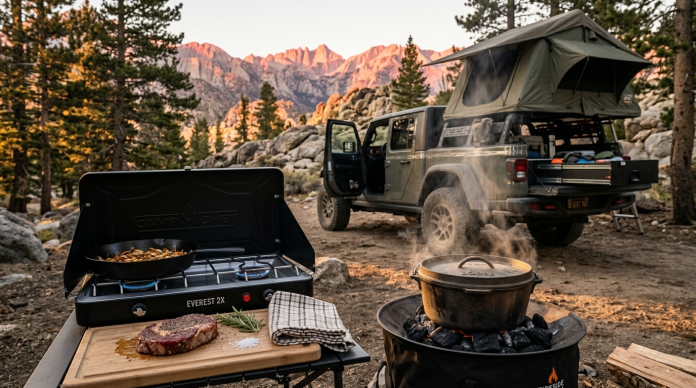 Your cooking surface determines every meal capability downstream. For base camp overlanding, a two-burner propane stove beats every other option on reliability, output, and ease. The Camp Chef Everest 2X pumps 20,000 BTU per burner and handles wind better than most competitors thanks to its enclosed burner design. Moreover, pairing it with a tabletop or a drop-down tailgate table gives you a complete stovetop kitchen rivaling your home range.