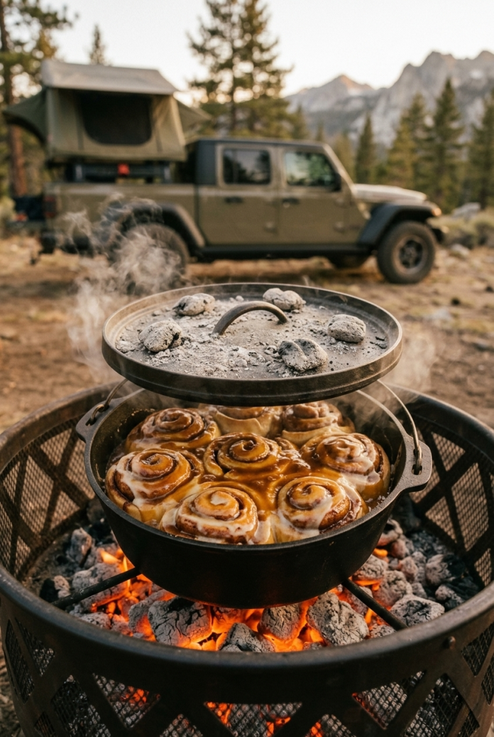 Dutch oven cinnamon rolls solve the weekend morale problem on day 2 or 3 of a trip. First, the smell alone wakes up the whole camp faster than a diesel fire-up. Second, a 10-inch Dutch oven on 19 top and 10 bottom briquettes holds 375F long enough to bake 8 jumbo rolls evenly. Third, the brown sugar and butter base caramelizes against the hot cast iron, yielding a sticky bottom layer competing head-on with any bakery roll.