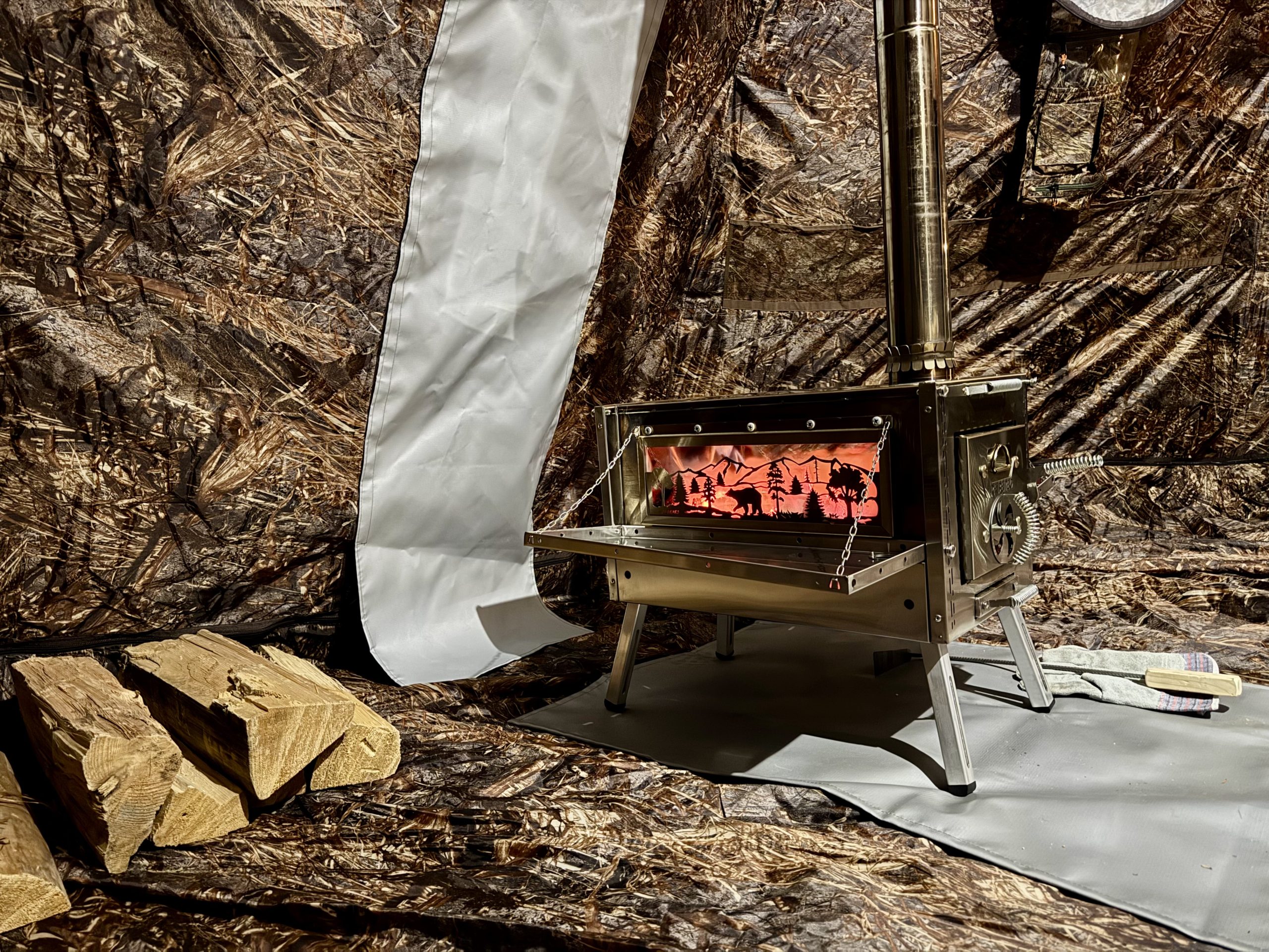 Stove operation is straightforward once you understand it. You’re not running a fire for hours. You’re doing short, hot burns to heat the tent quickly, then letting the fire die down. A hot tent with a small wood stove warms fast. Once it reaches temperature, minimal wood keeps it warm.
