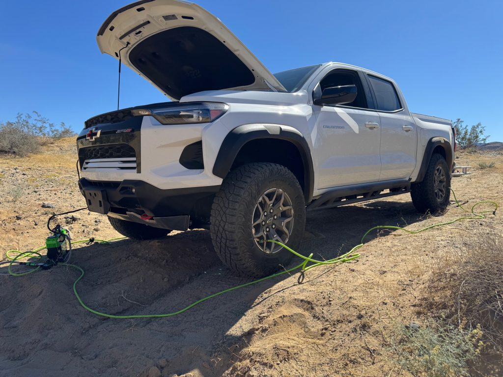 Chevy Colorado ZR2 with 33-inch tires: My current rig. Smaller tire volume means faster inflation times. I’m consistently seeing all four tires go from 18 PSI to 33 PSI in about 3 to 4 minutes. The compressor barely breaks a sweat on this setup.